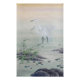 Grullas en el río chino es un pincel en el estilo tradicional chino del "gongbi". Acuarela y tinta sobre papel de arroz. Desde la antigüedad en China, la grúa ha sido considerada como un ave auspiciosa, junto al mítico fénix entre todos los pájaros con un aplomo divino. También fue un símbolo de longevidad e incorruptibilidad. Como una grúa era considerada la ave de mayor rango, se la usó como la demarcación más alta de la condición de tribunal de la China Imperial, y su aparición en la insignia de rango de la bata de un funcionario firmó que el que usaba era un funcionario de primer rango, o más alto. La grúa suele representarse sola en una roca rodeada por la marea creciente, que representa alcanzar el rango civil más alto. Como la palabra china "chao" significa tanto marea como gobierno, dinastía o tener una audiencia con un emperador. Así, una grúa de pie antes de la marea representa a un ministro de alto rango que se presenta ante su emperador. Incluso estar solo significa "haber logrado algo a través de sus propios esfuerzos", tener éxito a través de la diligencia en los estudios. GongBi es una técnica realista cuidadosa en la pintura china, lo opuesto al estilo interpretativo y libremente expresivo de XieYi. La técnica requiere que las pinceladas "sean tan detalladas como puedan ser", utilizando pinceles muy detallados que delimitan detalles con precisión y sin variación independiente o expresiva. Además, trata de lograr un equilibrio entre la expresión artística y la vitalidad, a menudo es muy colorida, y normalmente representa temas figurales o narrativos. Gongbi requiere dibujar con líneas finas primero para representar la imagen exagerada de los objetos y luego agrega tintas de tinta y colores capa por capa para acercarse a la perfección de la exquisitez y el arte fino.