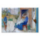 Chicas vestidos de azul sentados en sillas de fuerte respaldo cosiendo a mano. Bonito arte vintage del artista sueco Carl Larsson.