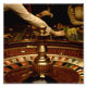 Fotografía de una hermosa rueda de ruleta de madera acabada sobre una mesa de ruleta ocupada por un comerciante y varios jugadores