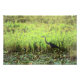Fotografía de una Gran Garza Azul caminando por un estanque. La superficie del estanque está cubierta de nenúfares. El estanque está rodeado de tallos de plantas verdes, que bordean un prado. Fotografía Copyright ©2021 Kimberly J Tilley.