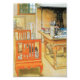 La oficina de Carl Larsson con su pequeña niña mirando a través de los peldaños de un banco de naranjas. El fondo incluye una mesa con pinceles y suministros para los artistas. Es una escena de la casa del artista.