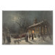 Vintage escena victoriana de familias yendo a la Iglesia en Navidades o Nochevieja. Un telón de fondo nevado con una iglesia iluminada y la luna mirando a través de los árboles.