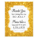 Este falso buffet de oro brillante y espumoso será el complemento perfecto para el bar de caramelos en tu ducha de novia. Presenta un fondo brillante de oro con un recorte de marco con la frase "Gracias por hacer este día tan alegre Por favor, tome una bolsa y llénala con alirios".