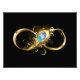 Oro, símbolo brillante de infinito, decorado con una pluma de pavo real de joyas con un fondo turquesa en negro.