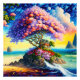 Una hermosa pintura digital de una exuberante isla verde en medio del océano. La isla está cubierta de árboles frondosos y flores, y el agua es azul claro. Un pequeño barco está anclado en la bahía y algunos se relajan en la playa. Este cuadro es perfecto para quien quiera escapar a un paraíso tropical.