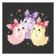 Tres adorables fantasmas de estilo kawaii de suaves colores pastel (rosa, violeta y amarillo) con arcos de bonito con brillo y estrellas. Este dulce y amigable diseño fantasma es perfecto para decoraciones de Halloween, productos para niños, o a cualquiera que ame los adorables personajes espeluznantes. El ilustracion es encantador y tiene un estilo artístico original, mágico y encantador, ideal para una amplia gama de productos, desde ropa hasta decoración casera.