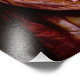 Una mujer con un vestido de satén rojo y un chal transparente sostiene un ramo de flores mientras sopla un gran chicle. La ropa y el peinado históricos sugieren una época pasada, pero el chicle introduce un giro juguetón y moderno.