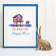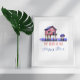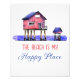 Un poster con una casa de playa sobre pilotes de color acuático, con la frase "La playa es mi lugar feliz". Ai art. contenido generativo