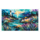 Faro y hermosas flores silvestres en una bahía al amanecer en colores de Arte AI morado, azul, verde y dorado por minx267