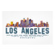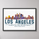 Ilustracion luminoso y colorido del horizonte de Los Ángeles, mostrando varios barrios y coordenadas geográficas. Captura la energía vibrante de la ciudad y el paisaje urbano icónico.