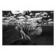Un pez león en un acuario de agua salada, con un reflejo del pescado en el nivel superficial del tanque. La foto está en blanco y negro, lo que hace que las rayas se vuelvan pop.