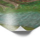 Pintura acrílica de una cabaña rodeada de árboles con un arroyo azul que corre a su lado y montañas al fondo.