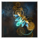 luciérnagas de vapor con alas transparentes azules y bombilla verde sobre fondo gastado, marrón y texturado. Estilo Steampunk.