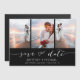 Elige las mejores fotos de tu sesión o de tus fotos favoritas de los dos para guardar la fecha. Las palabras que guardan la fecha están escritas a mano para darle un toque personal a la tarjeta. La parte frontal tiene 3 imágenes y la parte posterior tiene una imagen grande con un filtro blanco encima.