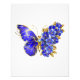 Joyería, azul, zafiro, mariposa de flor brillante con ala decorada con flores azules preciosas y hojas de oro sobre fondo blanco.