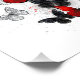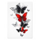 Montón de mariposas voladoras, realistas, rojas y negras morfo sobre fondo blanco con gotas de pintura.