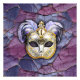 Una máscara de plata decorativa adornada con detalles de oro intrincados se destaca sobre un fondo violeta y resquebrajado. Plumas de plumas de lavanda acentúan el diseño regular de la máscara y su aspecto ornamental