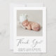 Anuncio mínimo de natalidad para bebé o bebé y tarjeta de agradecimiento con la foto de su recién nacido y "Gracias" en un elegante guión contemporáneo con un latido cardíaco. Personalice con su nombre completo, fecha de llegada y estadísticas de nacimiento en una simple tipografía moderna. Al revés, agrega una foto adicional y tu mensaje personalizado de agradecimiento y invitación.