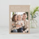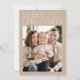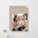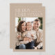 Tarjeta fotográfica navideña moderna con "Feliz Navidad" mostrada en la parte superior del diseño con letras blancas de moda con un fondo beige. Personalice la tarjeta de Navidades simples con su nombre y foto de familia. La tarjeta se invierte para mostrar un fondo beige con puntos blancos sutiles (nieve).