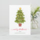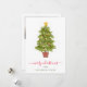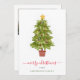 Salude a sus familiares, amigos y seres queridos esta temporada navideña con esta tarjeta de Navidad moderna y elegante. Cuenta con un árbol de Navidad en acuarela decorado con luces de Navidad coloridas y cerezas espolvoreadas en un poco de nieve y tiene una sencilla fuente de caligrafía roja de felicitación que dice “Feliz Navidad”. Puede agregar una foto de su familia y un mensaje sincero en la parte posterior.