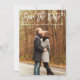 Guión De Pincel Moderno Guardar La Tarjeta De Foto De La Invitación De Compromiso De Fecha - Guión Blanco, Madera Rústica Atrás