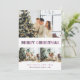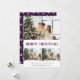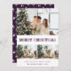 Foto personalizado púrpura tarjeta navideña Merry con un collage de fotos con un tipo de letra moderno en el frente y un fondo morado oscuro con nieve en caída y estrellas en la parte posterior. Personaliza fácilmente esta tarjeta de vacaciones de fotos moradas con tus fotos, el nombre de la familia y el año.