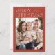 Tarjeta fotográfica navideña moderna con "Feliz Navidad" mostrada en la parte superior del diseño con letras blancas de moda con un fondo rojizo. Personalice la tarjeta de Navidades simples con su nombre y foto de familia. La tarjeta se invierte para mostrar un fondo de roya con puntos blancos sutiles (nieve).