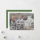 DISEÑO FRONTAL: Esta tarjeta de foto incluye un lugar para una foto horizontal con un tipo de letra simple grande sobre el blanco. Utilice una foto paisajística con el tema preferiblemente en la parte superior. El borde blanco alrededor de la foto deja espacio para un saludo y firma familiar. Si necesita mover algo, haga clic en el botón personalizar para realizar cambios. — DISEÑO DE VUELTA: Un patrón de chevron delgado retro de los años 70 sobre la parte posterior en tonos de oliva y verde salvia.