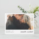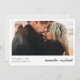 Esta sencilla y moderna boda fotográfica, ahorra la plantilla de la tarjeta de fecha, incluye sus nombres, fecha y ubicación del boda debajo de la foto. Hemos escogido un tipo de letra informal y relajado para sus nombres en el frente que le da una sensación cálida y familiar. El color de texto predeterminado en ambos lados es negro. Hemos puesto un símbolo '+' entre sus nombres, pero puede que desee cambiarlo a '&'. Puede elegir cambiar el tipo de letra, puntuación o color utilizado para varios elementos de texto de este diseño en la parte frontal y/o posterior. Por ejemplo, puede optar por dar un cierto color al texto de los nombres en la parte delantera, o por eliminar algo o cambiar un campo de texto por completo con un mensaje diferente. En la parte de atrás elegimos un orden atípico para la información, poniendo el texto 'por favor guarde la fecha' después del texto 'por el boda de', que le da un camino menos recorrido encanto. Puede modificar fácilmente este pedido o cambiar cualquier otra cosa que se ajuste a su estilo. En el frente, hemos puesto el fondo como transparente para dejar que el color del papel simplemente sirva como tono base. En la parte de atrás, hemos escogido un tono llamado Humo Blanco que es un gris muy claro que es mayormente blanco. Puede cambiar esto fácilmente seleccionando uno de los colores básicos de las herramientas de edición o introduciendo un número de color si tiene un color específico en mente que encontró en su investigación, o mirando la herramienta del espectro de colores y eligiendo algo a la vista. Notarán también que hemos usado todos los fundas inferiores para algunas líneas de texto en la parte posterior, y todas las mayúsculas para otras líneas. Puede que decida cambiarlo cuando edite sus propios detalles. Esta tarjeta es totalmente editable para adaptarse a su estilo. Usa las herramientas intuitivas de edición y diseño, tu foto favorita y tu inspiración para hacer de esta moda una boda fotográfica moderna, ¡excepto la tarjeta de fecha única!