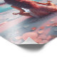 Mujer hermosa meditando en una playa de arena blanca y brillantes cristales de mar. Nubes esponjosas de color rosa y azul y agua azul pálido.