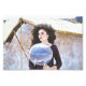 Retrato de una joven con pelo rizado sosteniendo un globo reflexivo bajo un baldaquín de tela, que transmite un sentido de contemplación y tranquilidad. El entorno se parece a un mercado rústico al aire libre.