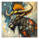 Una fantástica criatura que se parece a un búfalo está adornada con accesorios de vértigo, incluyendo gafas y armaduras intrincadas. El vibrante mohawk y el fondo dinámico de la criatura crean una atmósfera caprichosa y aventurera.