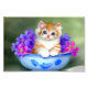 Foto impresa con un gatito a rayas blancas y naranja. Los grandes ojos azules del gatito se observan al sentarse en un bol azul con flores rosas y moradas. Un gran regalo para los amantes del gato y del arte victoriano.
