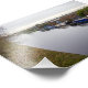 An autumnal scene along the tranquil Knottingley and Goole Canal, captured near Eggborough in North Yorkshire. Several colorful narrowboats are moored along the canal bank, reflecting gently in the calm water under an overcast sky. The left bank is lined with trees, many shedding their leaves, creating a carpet of golden foliage on the grassy path. In the background, hints of industrial infrastructure, including power lines and commercial buildings, blend into the rural landscape, characteristic of this working canal. The image conveys a sense of quiet rural life and the enduring presence of Britain's canal network. This image can be edited and transferred to multiple products of your choosing.