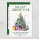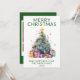 Foto árbol de Navidad con regalos para Navidades tarjeta en verde para un saludo festivo a la familia y amigos.