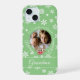 Vestira tu teléfono con esta linda portada de estuche de iPhone para renos de caricatura con el texto "Feliz Navidad" en una elegante tipografía de escritura blanca personalizada con tu propia foto. "Feliz Navidad" se puede cambiar. Añade tu apellido o tu propio texto. Personalizado personaje de reno con nariz brillante roja sobre un fondo verde verde azulado con copos de nieve blancos, tipografía de escritura blanca y una foto personalizada. Un regalo perfecto para la abuela, la mamá o cualquiera. Si necesitas ayuda para personalizarla, entonces envíame un correo electrónico y me gustaría ayudar. designsbykatz@gmail.com ¡Felices Fiestas!