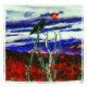 En un cielo nocturno con algunas nubes, hay una luna llena de color rojo que se eleva sobre una agrupación de montañas y colinas. Un cuervo está encaramado en una rama de un árbol Birch muerto que da al bosque de árboles con hojas rojas. Derechos reservados ©2018 Kimberly J Tilley.