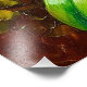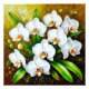 Una obra de arte detallada de vibrantes orquídeas blancas complementadas con un exuberante follaje verde, mostradas contra un fondo dorado-marrón texturizado, que muestra la elegancia y la belleza de los arreglos florales.
