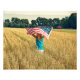 Chica corriendo en campo de trigo con bandera estadounidense.