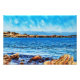 Una pintoresca vista de un paisaje costero con olas azules y playas rocosas y escarpadas bajo cielos soleados con un ambiente sereno.