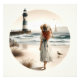 Una elegante joven vestida de blanco que recorre la orilla de arena, su gorra se inclinó contra la brisa mientras contemplaba un faro a rayas que se sostenía fuerte contra las olas. Gafas suaves enmarcan el primer plano mientras las aves marinas y un velero se deslizan por el horizonte, lo que añade un sentido de calma al paisaje costero. La suave acuarela combina el romanticismo y la serenidad, creando una atmósfera de costa atemporal inspirada en la cabaña, nostálgica y de ensueño. La IA generó obras de arte.