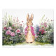 Pedro el Conejo soplando un chicle rosa en su jardín
