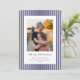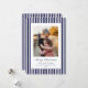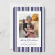 Una clásica tarjeta de vacaciones plana que presenta rayas finas azules y blancas, un mensaje de 'Feliz Navidad' en una fuente de pluma de tinta tradicional con texto totalmente personalizable debajo, y una foto. La parte posterior tiene el mismo patrón de rayas, pero se puede cambiar fácilmente por una foto si lo prefiere. Disponible en diferentes colores y con diferentes mensajes de vacaciones en mi tienda.