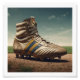 Muro de arte y decoración: Bota de fútbol vintage con acabado de cuero desgastado y sutil marca del Real Madrid con un fondo minimalista.