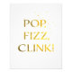 Cartel de la fiesta de bodas en un falso Relieve metalizado de oro: POP, FIZZ, CLINK!, salpicado de confetti sobre fondo blanco, hace una divertida exposición para cualquier evento temático especial de champán bar de alcohol!