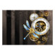 Diales antiguos con artes de oro y latón, decorados con libélula mecánica sobre fondo marrón, rayado. Steampunk.