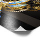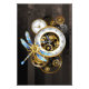 Diales antiguos con artes de oro y latón, decorados con libélula mecánica sobre fondo marrón, rayado. Steampunk.