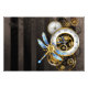 Diales antiguos con artes de oro y latón, decorados con libélula mecánica sobre fondo marrón, rayado. Steampunk.