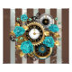 Reloj de época con estampado, adornado con joyas, manos de la hora de oro y números latinos con rosas turquesa sobre fondo marrón y rayas. Estilo Steampunk.