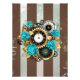 Reloj de época con estampado, adornado con joyas, manos de la hora de oro y números latinos con rosas turquesa sobre fondo marrón y rayas. Estilo Steampunk.